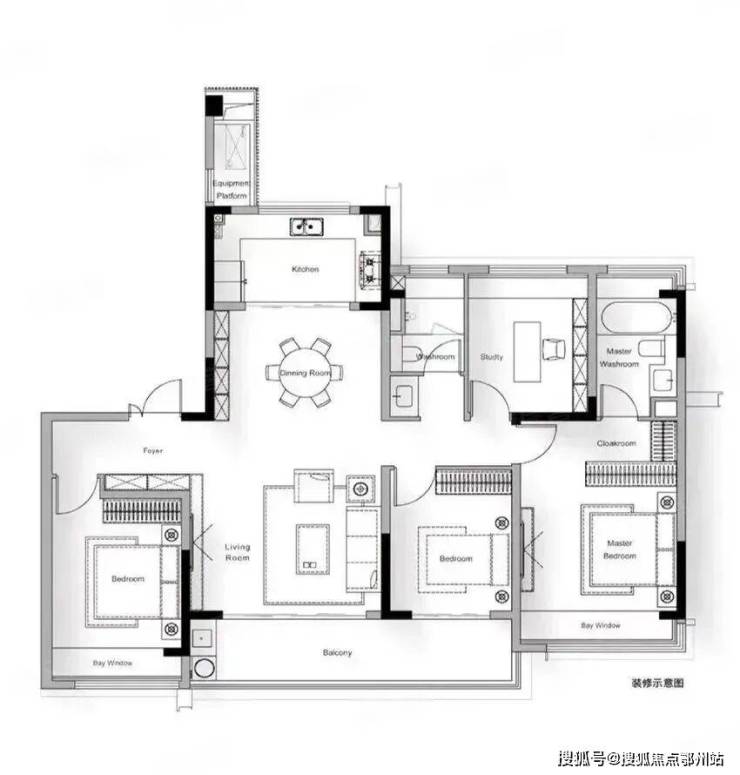 户型点评:这一户型是比较方正的四房两卫,整体做了的大面宽短进深设计。