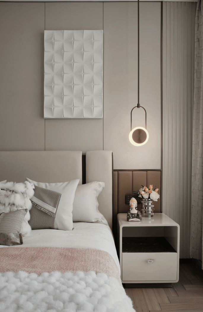 主卧衣帽间与书房通铺深色实木地板,为整个空间奠定了静谧的色感,营造一种回归纯粹与本真的氛围。次卧往往可以体现更广阔的生活理念,在与整体设计风格和谐一致的基础上跳出主卧的氛围 ,提供一个不一样的情感空间。时光在这里好像变得绵长,缓慢也表现出隐秘而深邃的价值。