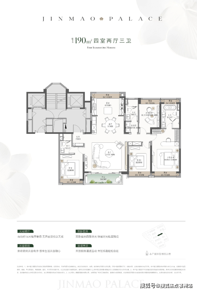 建面约190㎡ 四房三厅三卫(终极改善):压轴楼王户型,四开间朝南,双套间设计(主卧带双台盆卫浴+步入式衣帽间),总统套房级尺度。全屋一体化设计,隐形门+弧线美学,彰显身份尊崇,适合追求顶级居住品质的家庭。