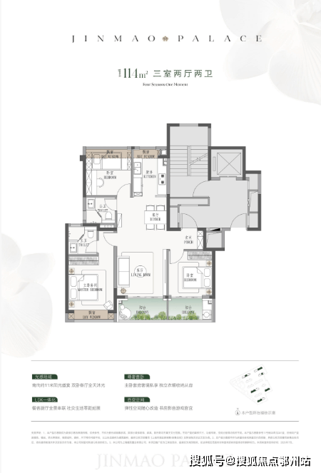 ▫️ 建面约114㎡ 三房两厅两卫(入门优选):高性价比上车款,三开间朝南,6.8米宽景双联阳台,得房率超80%。独立玄关+全明厨卫,适合三口之家,预算友好(总价700万起)。