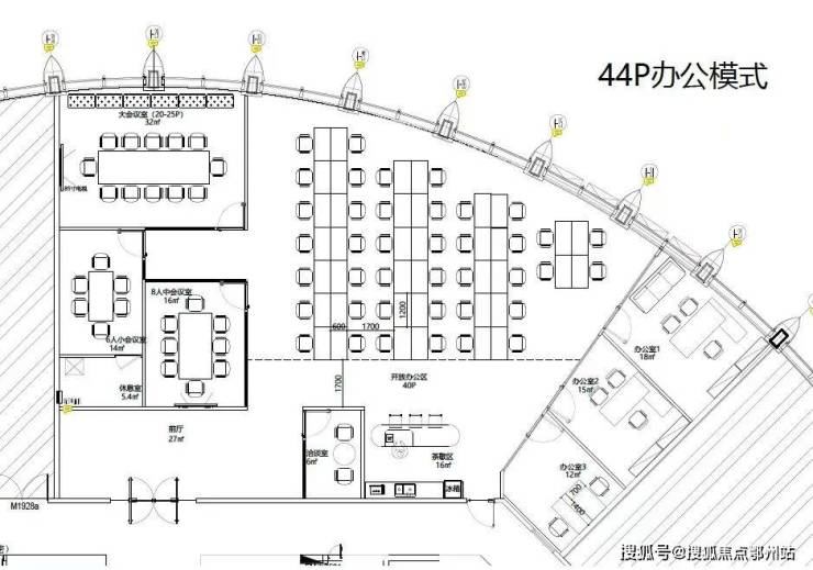 格局:18工位+4会议室+3办公室,有茶水间(最多容纳56人)