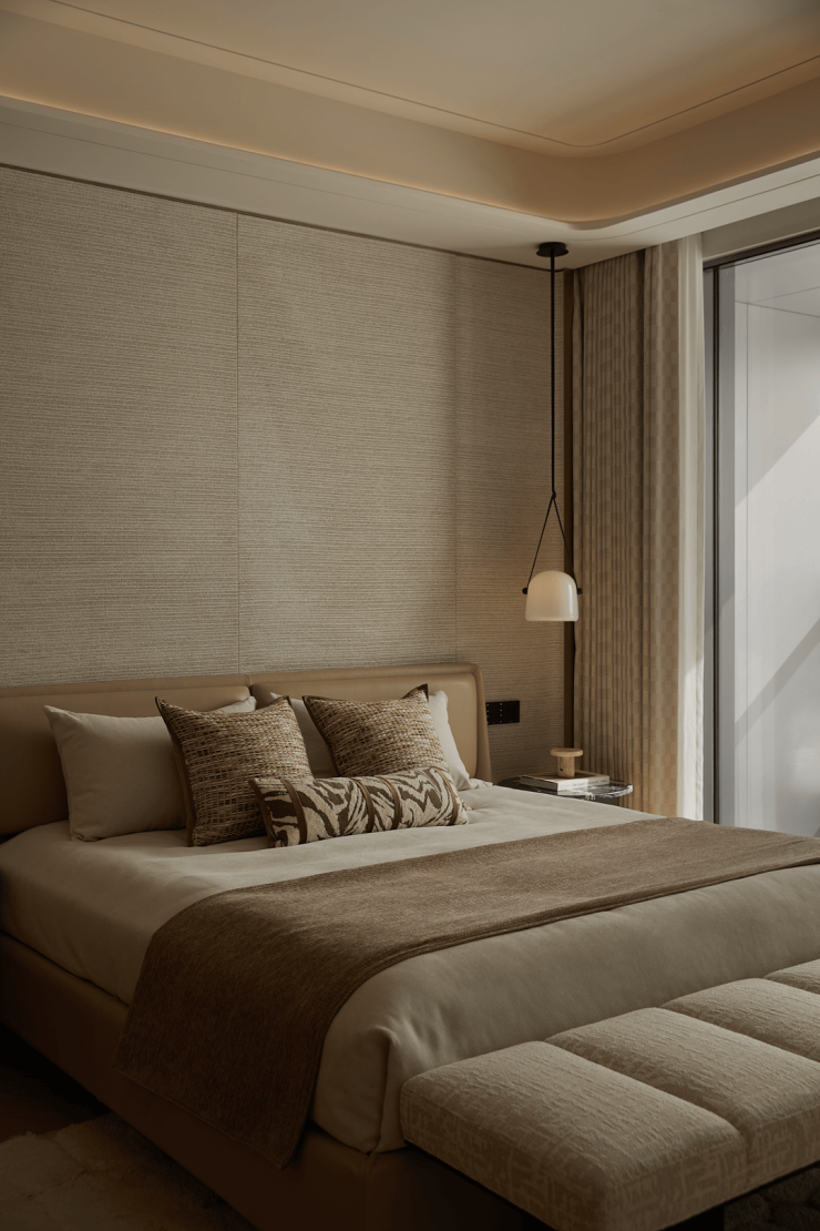 卧室空间亦毫不妥协,主卧采用Poliform定制衣柜,次卧及功能间均配备定制衣柜,兼顾审美与实用收纳。项目还广泛运用旭格系统门窗(部分)、摩根全屋智能、梵蒂斯铸铝门及KFV智能门锁,从静音、安防到智能控制,全面构建安全、便捷、宁静的居住体验。