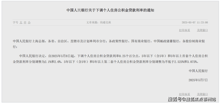 5月7日,央行等三部门召开“一揽子金融政策支持稳市场稳预期”新闻发布会,明确降低个人住房公积金贷款利率0.25个百分点,5年期以上首套房利率由2.85%降至2.6%,其他期限的利率同步调整。