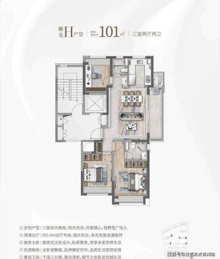③建面约101㎡H户型:三面采光,全能景观王炸边厅户型!