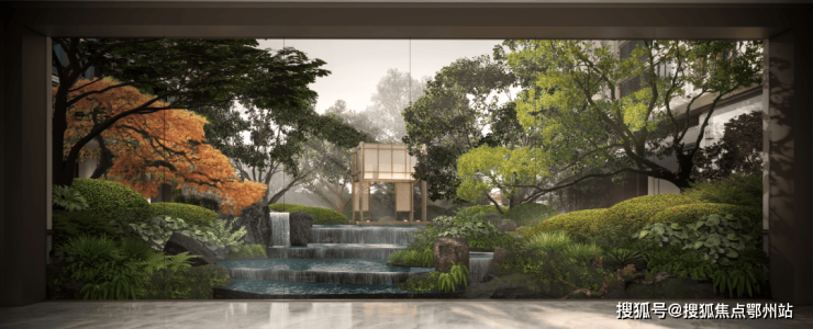 反复考量水景面积、叠水水深、水体吨数,精确计算出能耗比,最后将社区约300㎡的水景区域,科学划分为5个相互呼应的独立模块,并分别配备循环系统,结合业主每天的生活场景,规划不同模块水系开放时间。