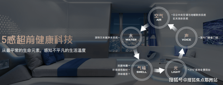 项目在健康方面匠筑5感超前的健康科技,从五个最平常的生命元素,提前为每一位业主感知不平凡的生活温度。