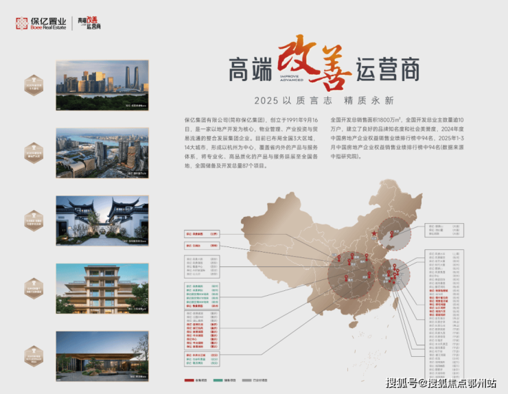 浙江品牌房企20强,2025年应势发布“高端改善运营商”的全新定位,秉承“美好生活精质家”的品牌理念,坚持精耕深拓,专注产品,稳健前行。已布局全国三大区域、14大重点城市。先后打造杭州奥体核心地标——奥邸国际;亚洲十大豪宅——观雲钱塘城;千万级湘湖中式合院——湖风雅园︱和院等标杆之作