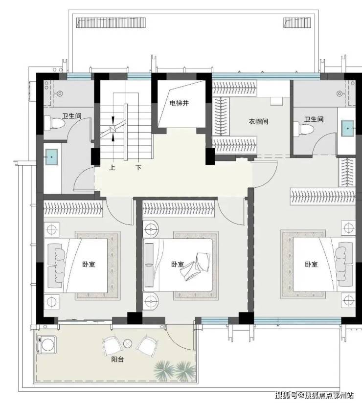 三楼是 标准的总统式套房,卫生间有大浴缸和双台盆,卧室放得下king size的大床,衣帽间是单独而设且带窗的,书房是朝南的,外面还自带星空露台。