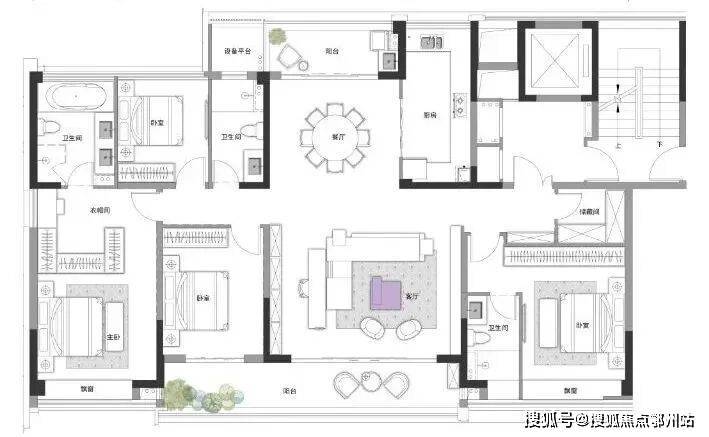 比如厨房可以做成中西双厨,餐厅外接独立阳台,玄关后设独立储藏室,阳台面宽约9.4米,进深约1.7米……