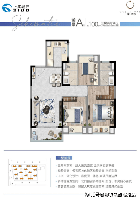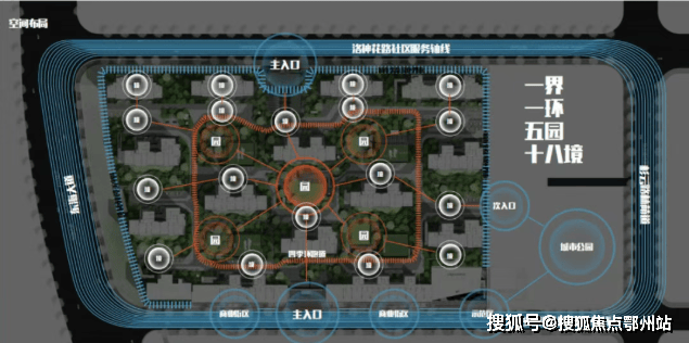 社区采用人车分流设计,在景观规划上,上实望海采用“一界一环五园十八境”景观法则,侧写九大生活场景。