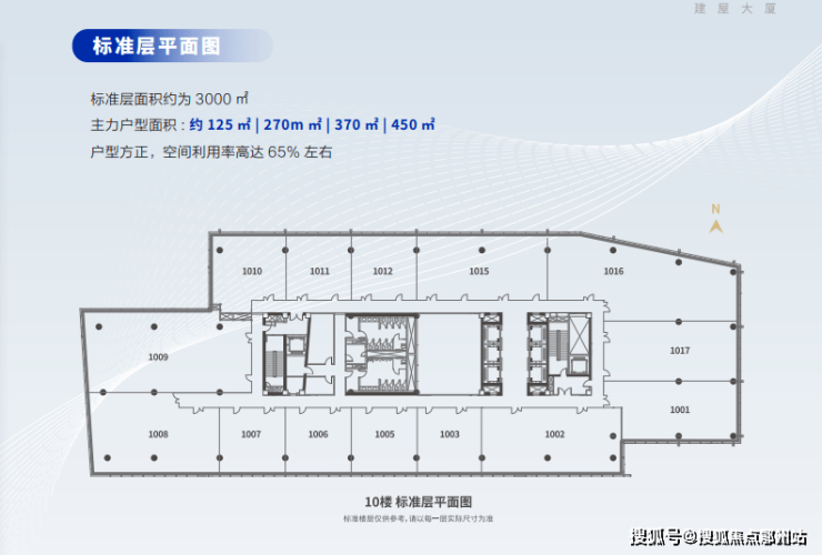 标准层面积约为3000㎡,主力户型面积多种多样,有约125㎡| 270m ㎡| 370㎡| 450㎡多种选择!满足您的期待,户型方正,空间利用率高达65%左右!