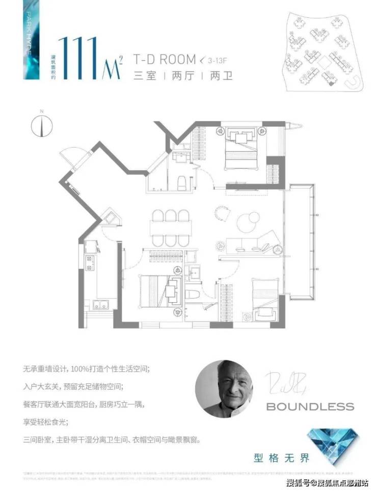 比如,建筑面积约104㎡3房,客厅面宽达到约3.6米,主