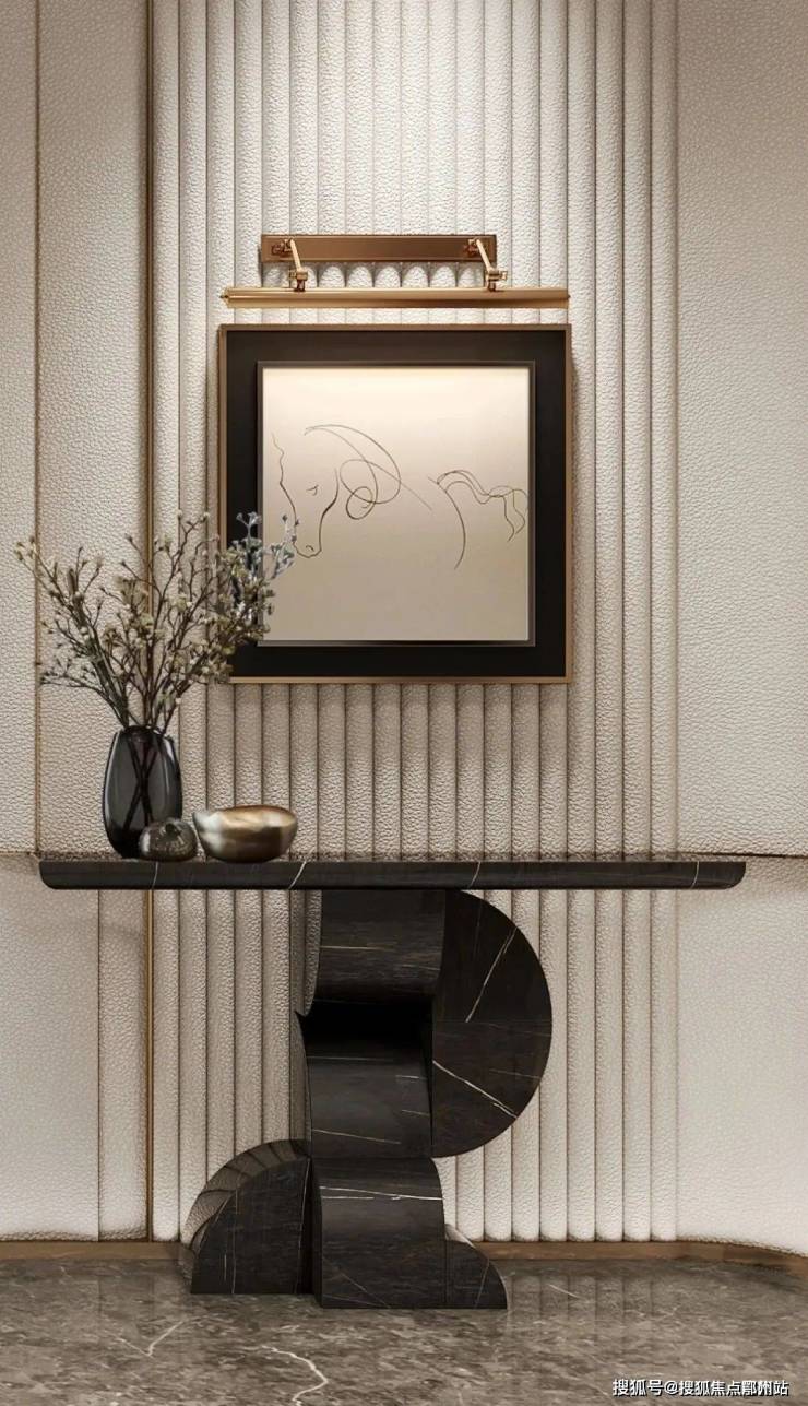 层高约4.2米,并配置两梯一户的独立电梯厅。从首层大堂步入,超大水晶吊灯高悬,墨色石材墙面纹路氤氲,地面则是繁复的大理石拼花,一派高门华屋的气势。