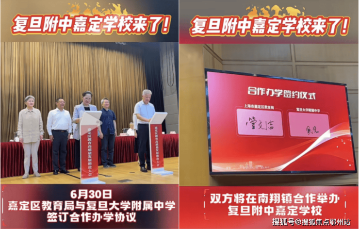 6月30日,第一教育官方视频号发布重磅消息:复旦附中嘉定学校来了!嘉定区教育局与复旦附中签订合作办学协议,双方将在南翔镇举办复旦附中嘉定学校!