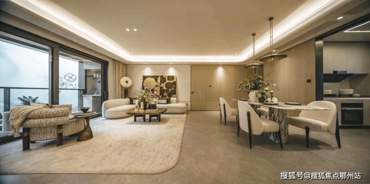 该户型南向面宽达约 12.2米, LDKB一体化设计,将客厅、餐厅、厨房和阳台融为一体,形成了一个宽敞通透的公共活动空间,不仅增加了空间的互动性,还提升了居住的舒适度。