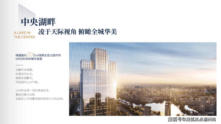 空中大堂:跃 38 高层,于峰峦之上,一揽城市繁华胜景,中央湖景风光,创领商务新风范。