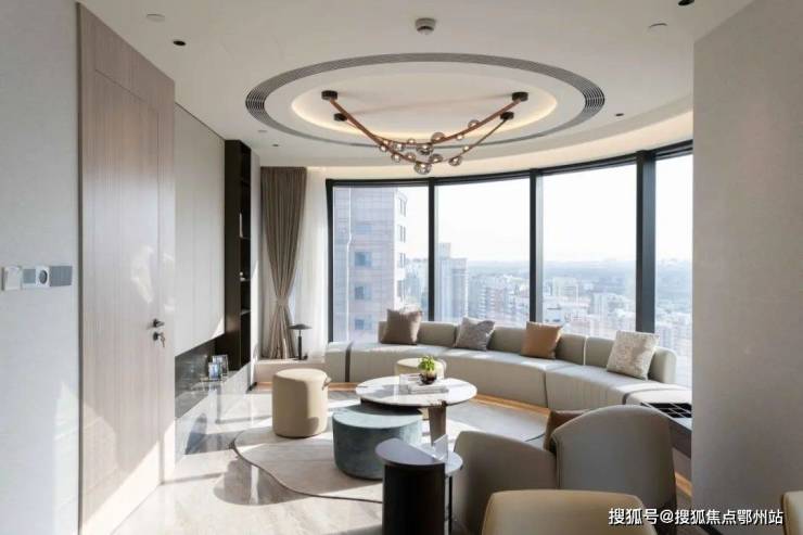 已经开放的100㎡ (建面)样板间,大面积落地玻璃窗采用弧形设计,带来了优越的采光和视野。