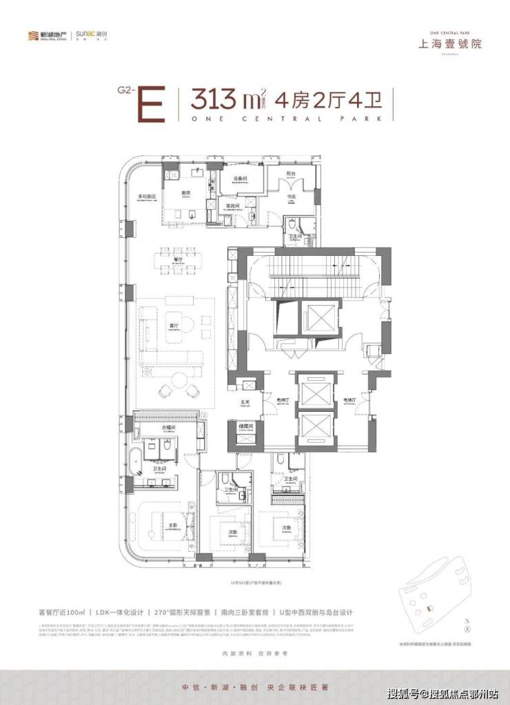 超80%的得房率,LDK一体化厅+西厨岛台,L型大面积转角落地窗,呈现出270度的幕布视野,这个王者公区的尺度不到现场来看,根本是你想象不到的震撼!