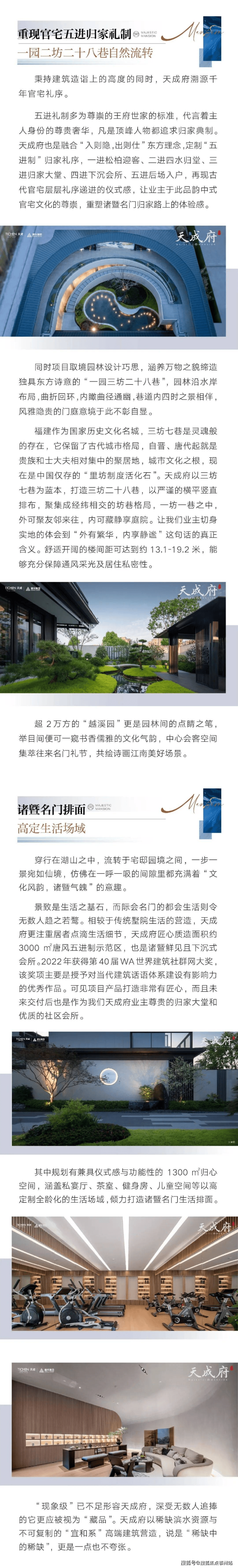 目前, 天成府以建筑面积约193-300㎡中式合院、建筑面积约112-165㎡当代奢宅面世诸暨,东方美学生活馆也将以盛装为诸暨高端圈层开启。一部跳脱于诸暨传统中式的当代东方经典,一座内外兼修造价皆昂贵的府门大宅,一个由天成房产和建华集团共联袂的品质安心之选,此前少见,此后难得,值得全诸暨“品位家们”荣归与珍藏。