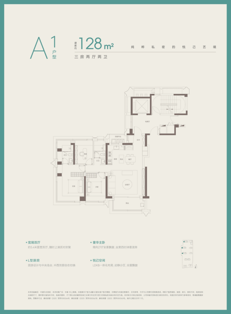 建面约128㎡的户型来看: 整个户型拥有约270°的超级采光面,客厅有宽面阳台、双次卧+次卫有飘窗、主卧有约270°的无柱转角飘窗+双飘窗的主卫 ,整个空间采光通透度相当出众。 最重要的是,这6飘窗+1个约270°的无柱飘窗全是赠送空间!