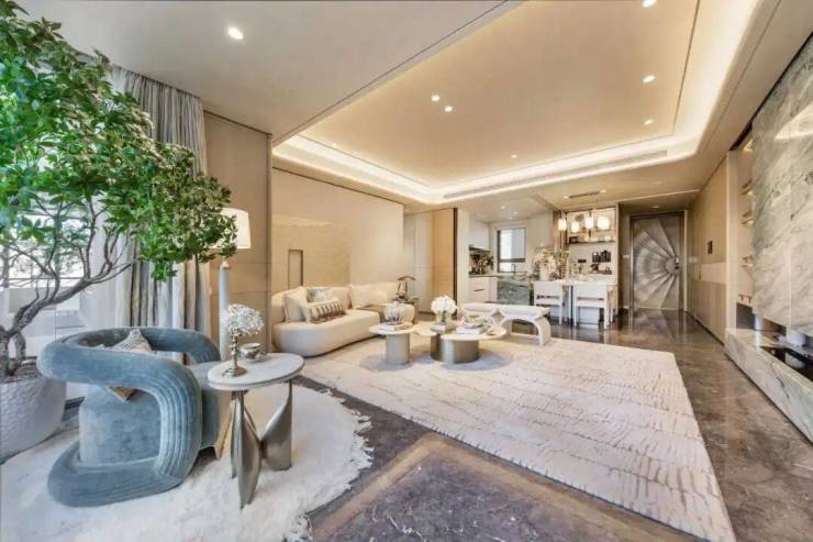 走进室内,四开间朝南,面宽约15.1米,采光充足。客厅面宽约8米,LDKB一体化巨型方厅设计,配合全景落地窗,开阔视野如打开一整幅自然画卷。