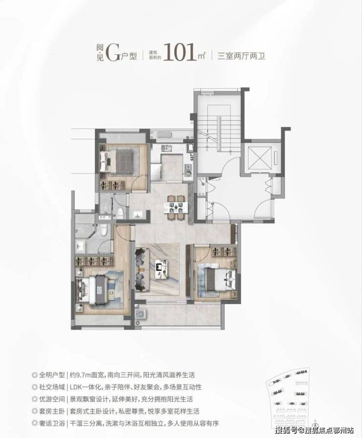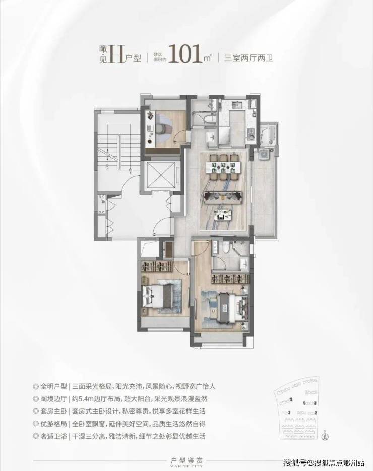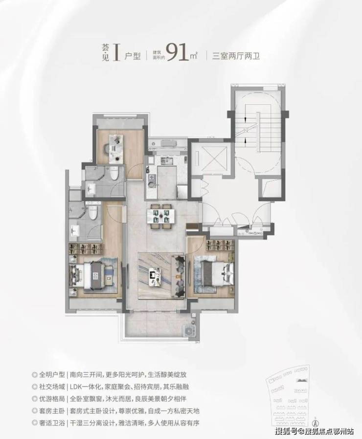 三面采光,全能景观王炸边厅户型!同样是3房2卫的配置,功能性与舒适度兼具。