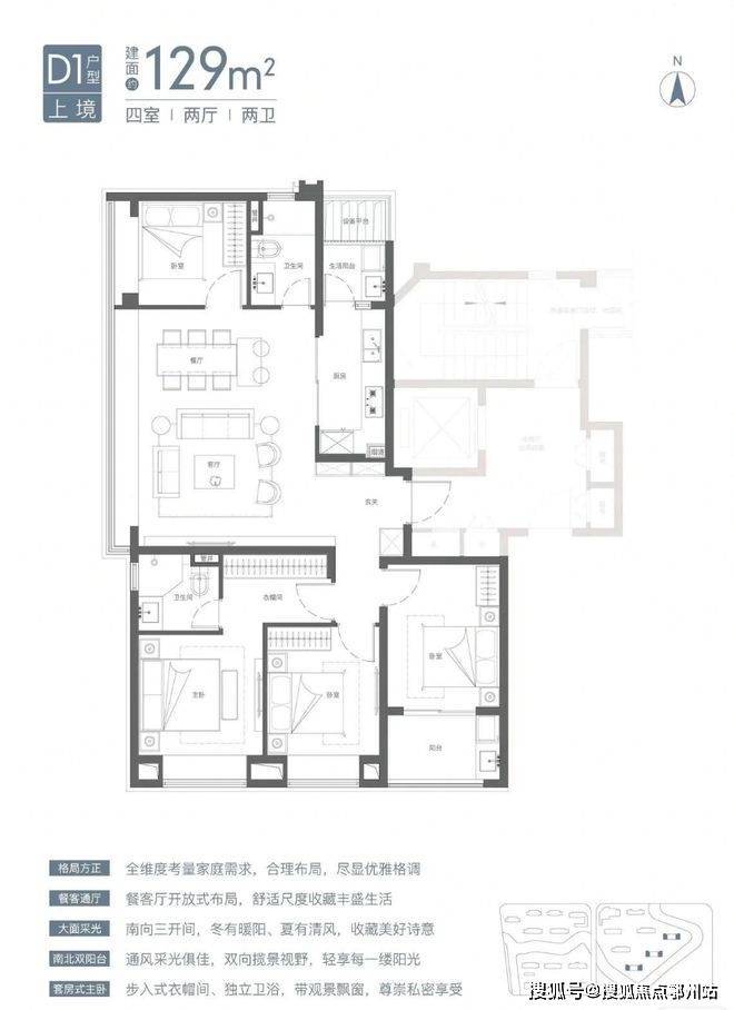 预算充足的小伙伴,可以选建面约129㎡4房,经典的三卧朝南、边套观景户型。
