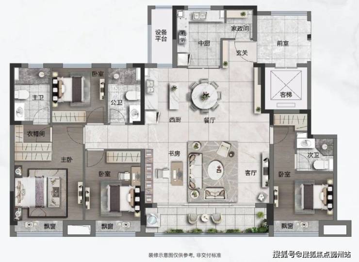 更让人惊艳的是卧室,三个朝南卧室都自带飘窗。其中东西两侧构成双主卧设计。