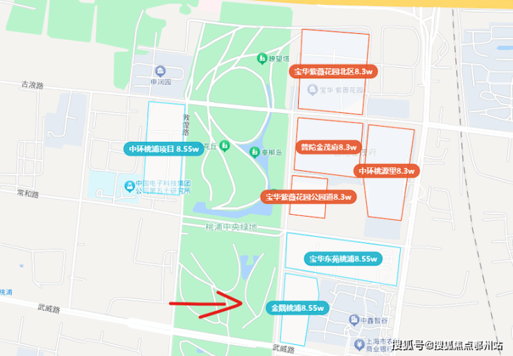 整个项目包含两个地块,地理位置就在宝华紫薇之星南侧,联动价8.55万元/㎡。这块地是2023年四批次土拍时由金隅地产拿下,也是紧挨桃浦绿地的景观房。