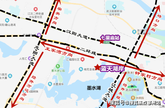 交通路网:区域内有 主干道二环线、江城大道、芳草路等。从项目出发,沿着二环线,往西直达龙阳大道,到达王家湾商圈;往东直达江城大道,到达五里墩、钟家村,或过墨水湖大桥到达沌口永旺,自驾便利。