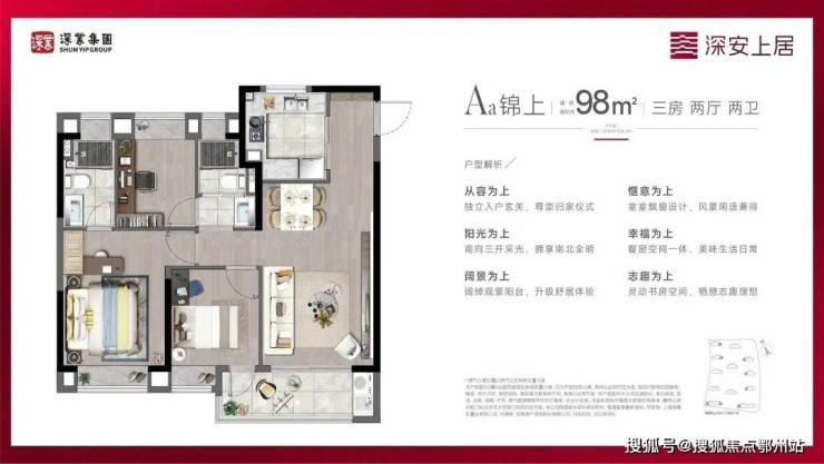 深安上居的12栋17-18层小高层,围绕生态景观错落排布。开阔的楼间距不仅让组团景观更加大气,也保证了采光与通风效果。建筑面积约88-98㎡臻装三房明星户型收获一众粉丝。“三开间朝南+双朝南卧室带飘窗+动静分离+客餐厅一体化”的空间尺度,为全生命周期家庭设计。为线上青年的理想生活精工精筑,堪称300万级产品封面之作。