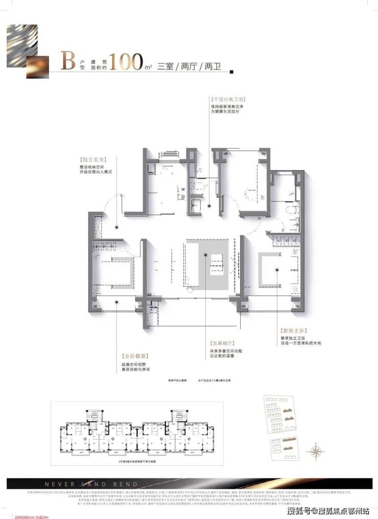 建面约100㎡宽厅三房,改善家庭至优选: 在南向三开间的基础上,该户型“创新横向宽厅,营造百平米少有的客厅尺度“打造3.5南向面宽。
