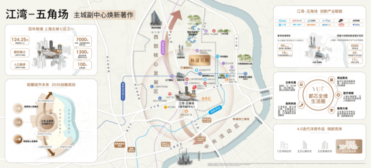 以五角场环岛为中心的巨型商业涵盖了上海合生汇、上海万达商业广场、百联又一城、悠迈生活广场(原东方商厦)、五角场NS2地块大型商业广场(规划)、苏宁电器广场等。