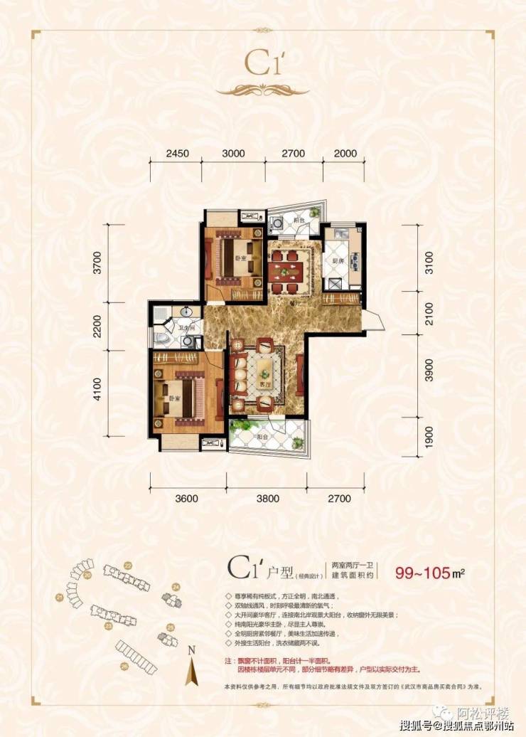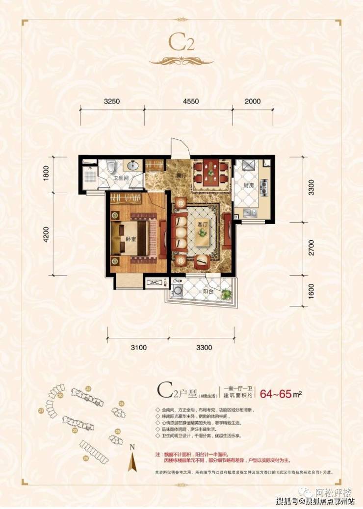 C2户型位于22楼东侧1、2单元和23号楼东侧1单元中间户,该户型客厅、主卧全朝南,采光较佳;整体户型方正,几乎没有浪费的空间;L型厨房设计,符合操作习惯,又合理利用空间。