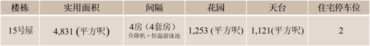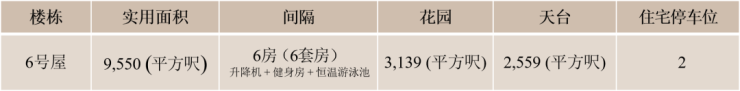 设施:每幢洋房尊设私人花园、独立车库、內置升降机;其中有13幢洋房佣有私人游泳池(除16、17、18幢无泳池)