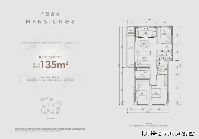 建面约135方边套户型,在空间设计上,升级户型灵动性和社交空间最大化,精心布局入户玄关,近40方的光幕大横厅、主卧星级套房、全景飘窗、约4.3米面宽的厨房等空间系统,完全是以豪宅的尺度奢享不同阶段的生活。