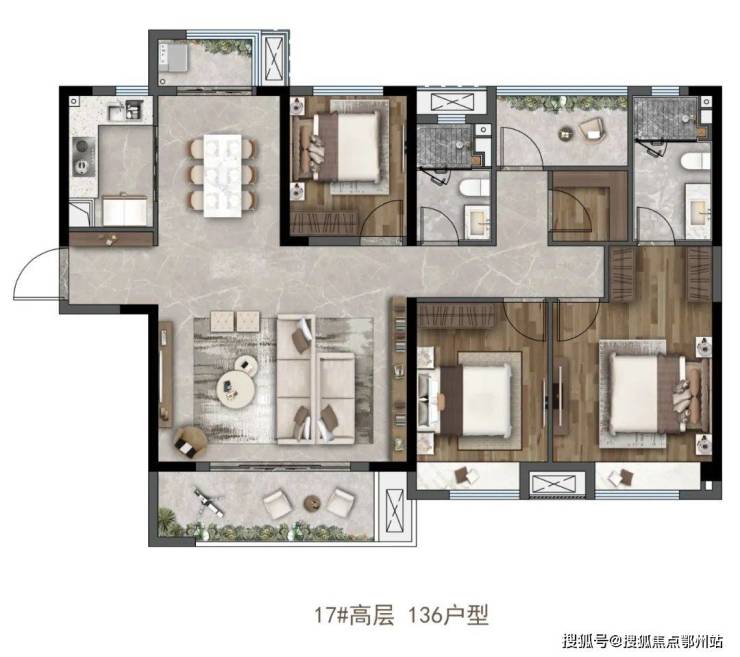 主卧套间带独立卫浴,三个卧室都不小,少见的刚需阔景户型。