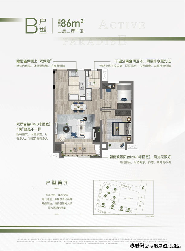 主力户型建面约86平两房两厅一卫