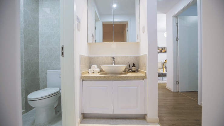 也正是因为一个卫生间,才能做出这样的尺度感。镜柜打开就是收纳空间,整体干湿分离,一边可以洗脸刷牙,一边可以上厕所,尽可能满足多人口使用的需求。即使早上也来得及,三口之家的使用绰绰有余。