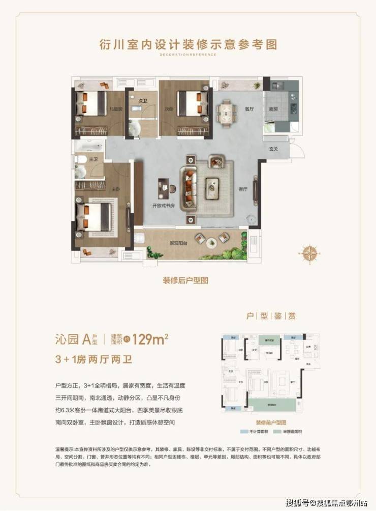 首开建面约119-129㎡四房两厅两卫户型,朝南大面宽,双联大阳台,美好生活由此开启。建面约129㎡3+X户型,做到了三开间朝南,双联跑道式阳台,动静分区,餐厅还带飘窗,这在当下长沙楼市中是相当炸裂的存在,还有一个百变的多功能厅。