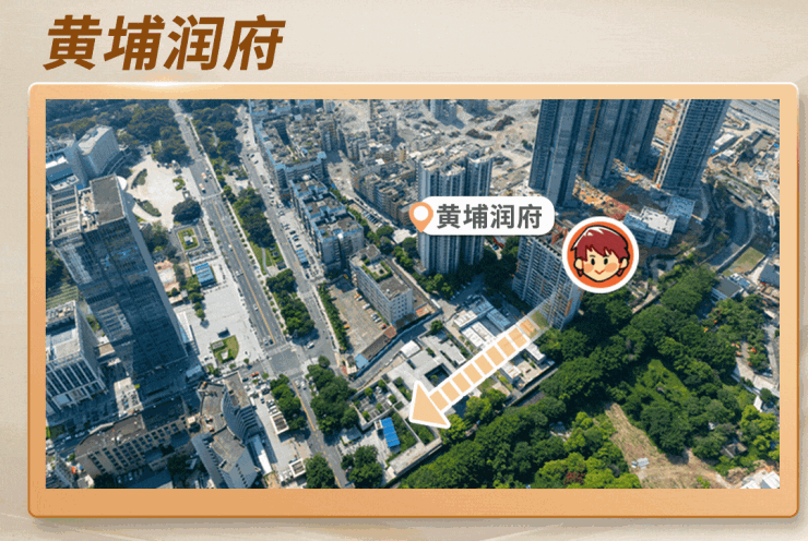 北面一路之隔是原黄埔区政府,直线约600米到保利中央公馆、黄埔体育馆;东面是万科城市之光,它就是位于惠润广场正对面的新溪旧改。