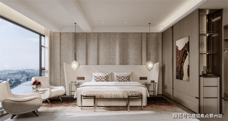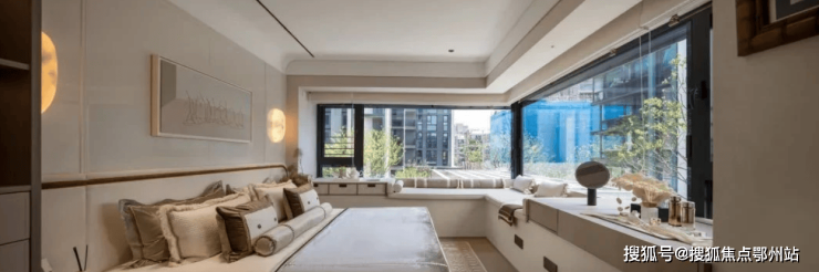主卧拥有270度环幕飘窗,视野和采光优越,配备了高奢卫生间,空间感、尊崇感拉到顶格。