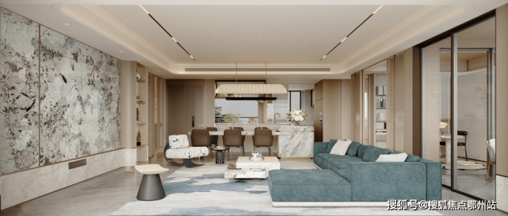 全屋色调雅致温馨,多种材质搭配和谐。软装设计搭配皮革、木质、岩石、贵金属,运用不同材质的交叠,与空间体量呼应。