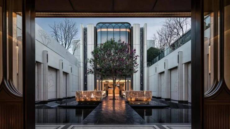 不仅是金钱上的奢侈,更是时间广度的奢侈。比如,整个下沉式庭院材料选用 土耳其进口老虎玉,由匠人耗时60天手工打磨定制,可见海上·清和玺对业主归家仪式感设计的用心与苛求。海派光厅之外的归家迎宾树木更是由设计师 辗转多个城市才寻到的、树龄超60年的福木“紫薇”。