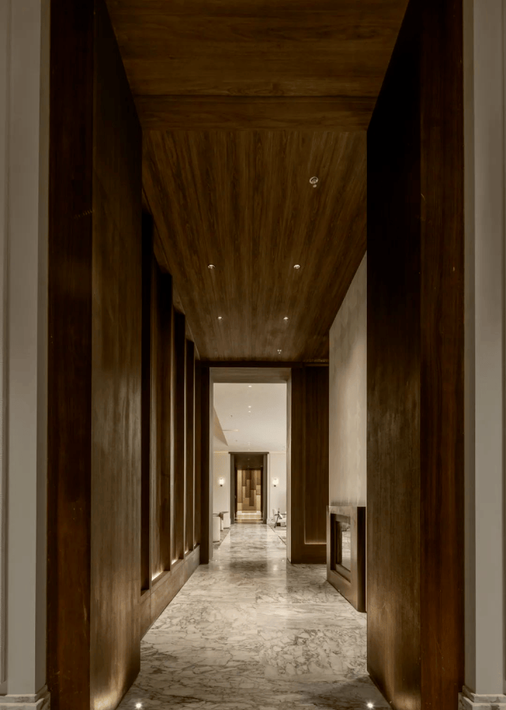 比如 红酒雪茄厅, 设计灵感来源于迪拜奢华酒店The Lana,颇有一种老上海风情;多功能区是一个 270度水景环绕的区域, 玻璃门可开可合,关上就是私密空间,打开就能亲近自然。
