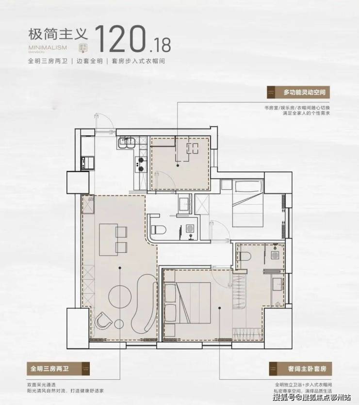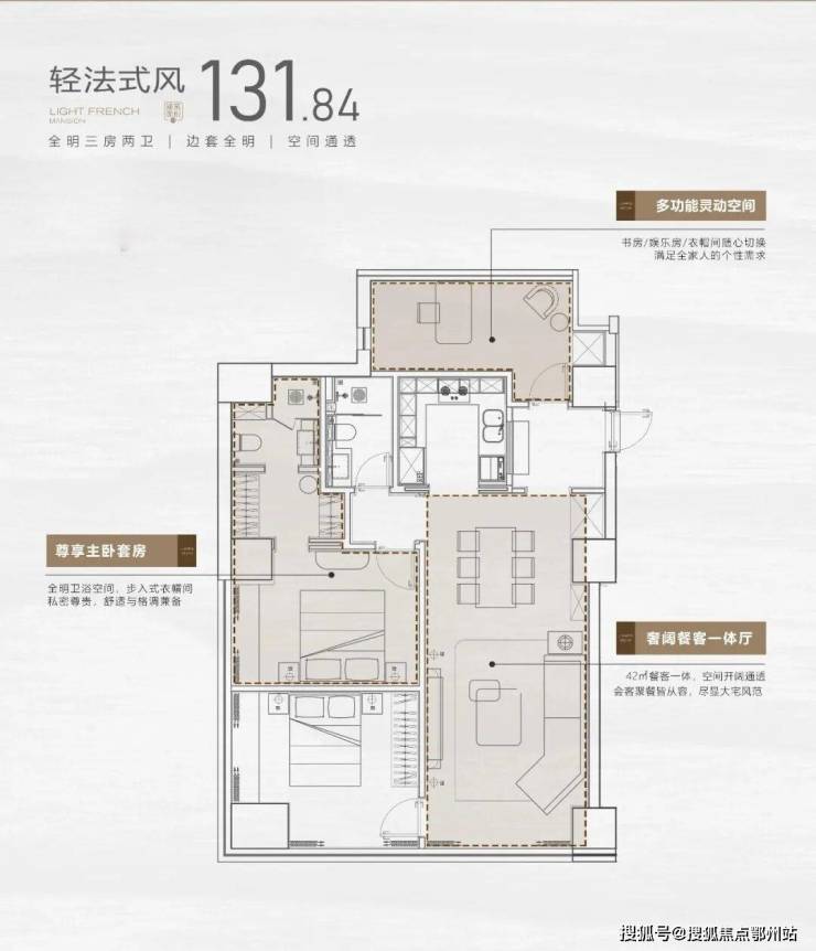 户型设计上,打破公寓常规暗间的局限,项目全部设计成全明2房或3房格局,做到没有一个暗间的居住空间,并全系标配主卧套房+双卫配置,提升居住配置。