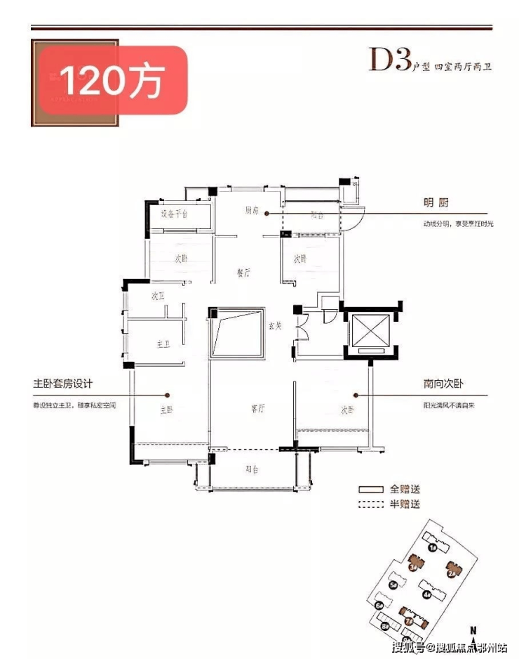 户型经典,95平10.1米南向面宽大三房;120平10.4米南向面宽功能四房;
