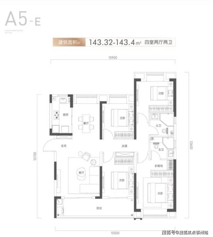 建面约143㎡的A5-E户型,4室2厅2卫:边户,三开间朝南;南北通透,南北双阳台,主卧带独立卫生间,并且因为是3梯4户结构,旁边有两部电梯。