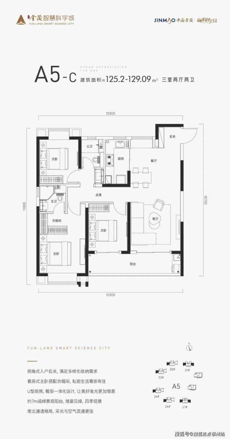 建面约125-129㎡的A5-c户型,3室2厅2卫:边户,三开间朝南;南北通透,户型方正,动静分区,主卧带独立卫生间,南向大阳台连通卧室。