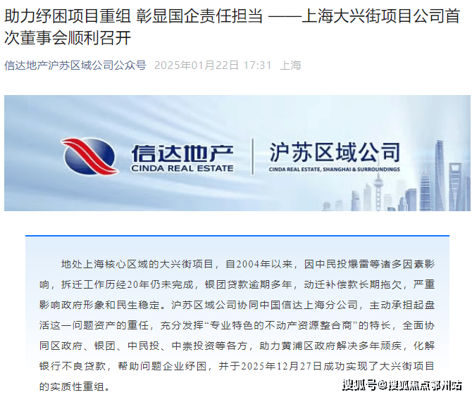 重组方案批复后,2025年1月19日,上海大兴街项目公司首次董事会圆满召开,中国信达上海分公司、信达地产沪苏区域公司、中崇集团各方股东、董事出席了会议,标志着大兴街项目终于步入正轨。